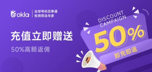 Okla号码检测筛选专家集全球各国热门APP于一体,致力于一个平台满足用户出海的所有需求!现平台特惠活动,充值立即赠送50%返佣,欢迎大家来使用。